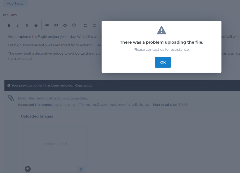 I'm trying to post something and attach some pictures. The file sizes are under 1mb, but I get upload failed every time.